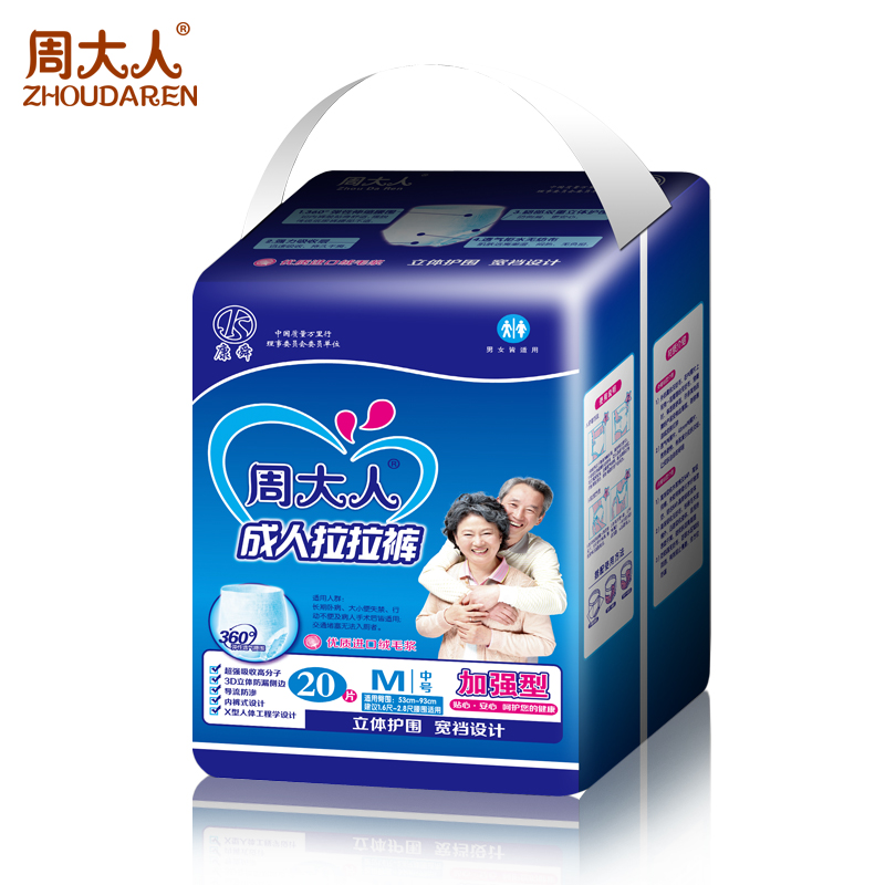周大人成人拉拉褲采用進口高分子,無紡布,3D立體防漏設計,做到吸收好,防側漏,干爽舒適,給老人最好的體驗!
